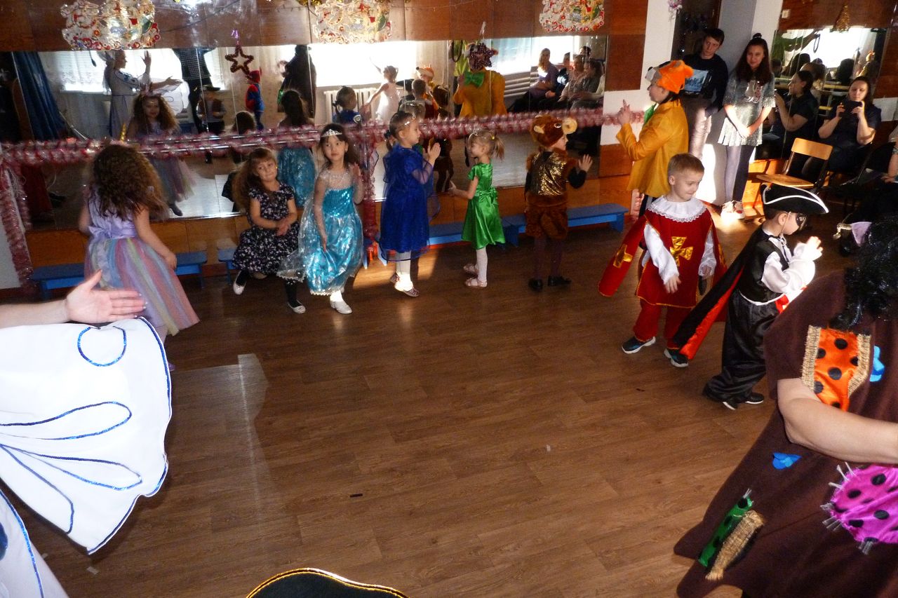 Нарядная красавица елка встречала своих гостей в украшенном зале Дома детского творчества. Музыка, красочное оформление, декорации и костюмы, веселые конкурсы, хороводы вокруг елки создавали у детей ощущение праздника, заряжали весельем и радостным предвкушением встречи со сказочными героями.
