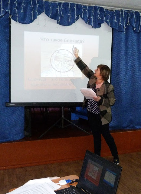 На протяжении всего урока звучали стихи о войне, о блокаде, о подвиге. Все это сопровождалось презентацией и фильмом о блокадном Ленинграде.