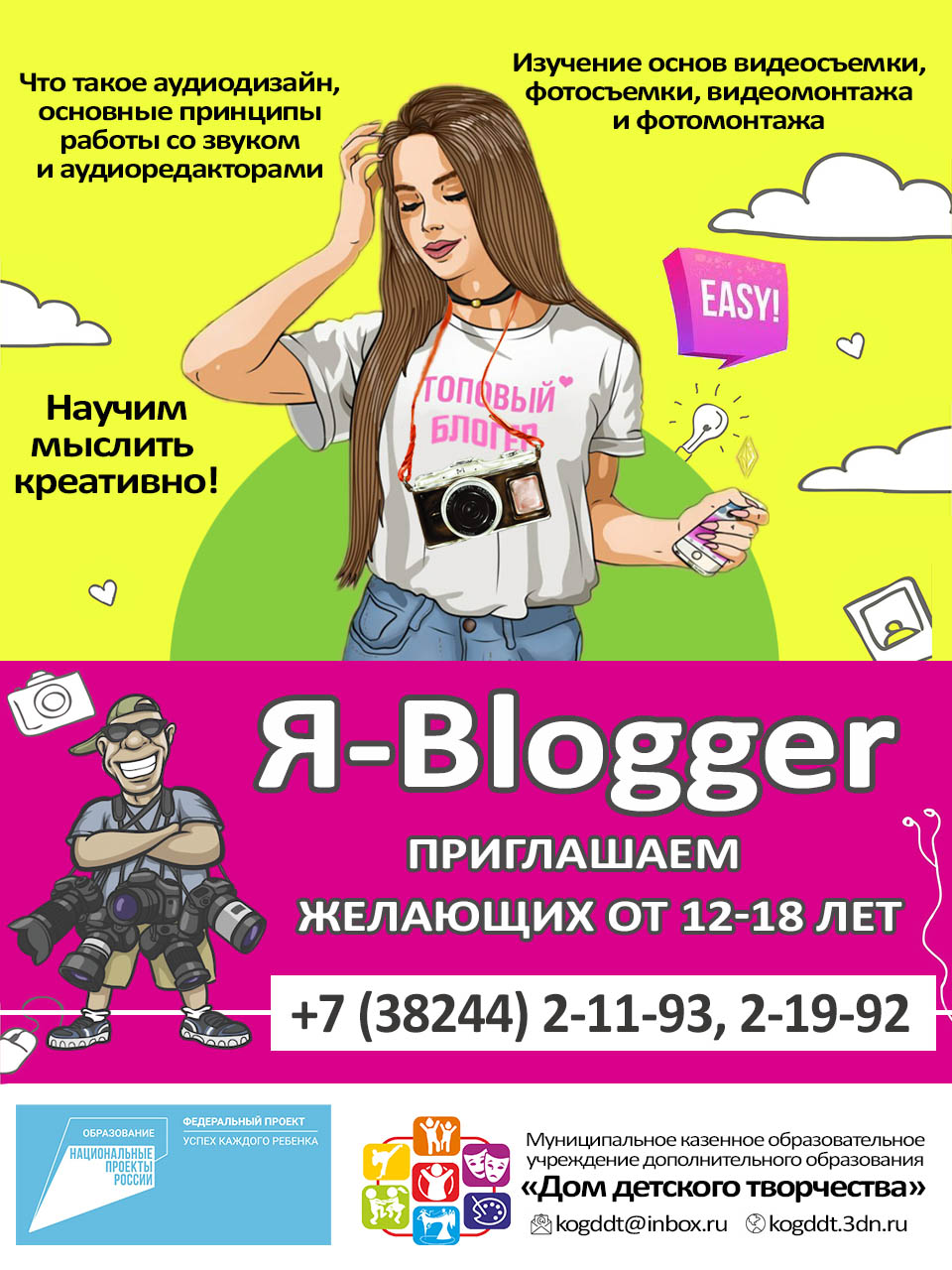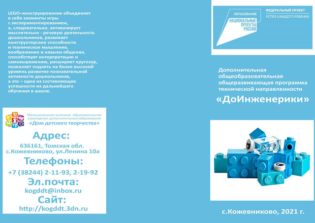 В рамках этого проекта с сентября 2021 г. в нашем Доме творчества открываются два детских объединения технической направленности: «ДоИнженерики» - для детей 5-6 лет и «Я-Blogger» -для ребят 12-18 лет.