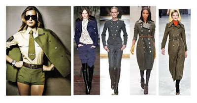 Милитари стиль. Одежда с элементами военного костюма: погоны, эполеты, накладные карманы, шнуровка и т. п. Основные цвета: серо-зеленый, оливковый, хаки.