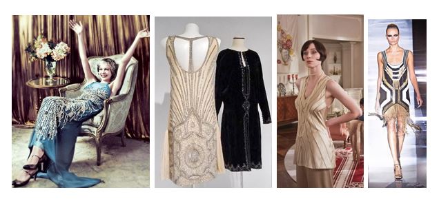 Арт-деко - ретро-стиль. Типичны роскошные ткани, обилие отделки, заниженная талия, отсутствие акцента на груди и бедрах. А также стеклянные бусы, блёстки и длинная бахрома.