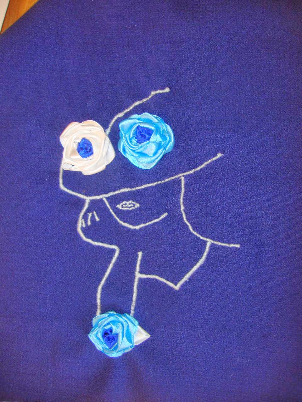 9. Изготовить «собранную ленту» в петельки – 4 штуки и пришить к розочкам на ткань.