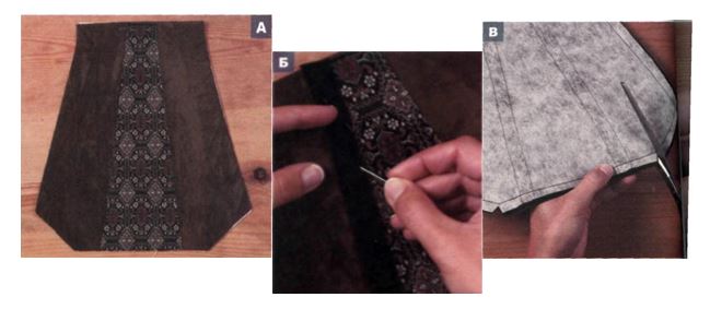 Приколите булавками бархатные ленты по краям аппликации (Б), закрывая необработанные срезы ткани. Проложите швы по обеим кромкам каждой ленты. Слегка отутюжьте с изнаночной стороны через влажную ткань.