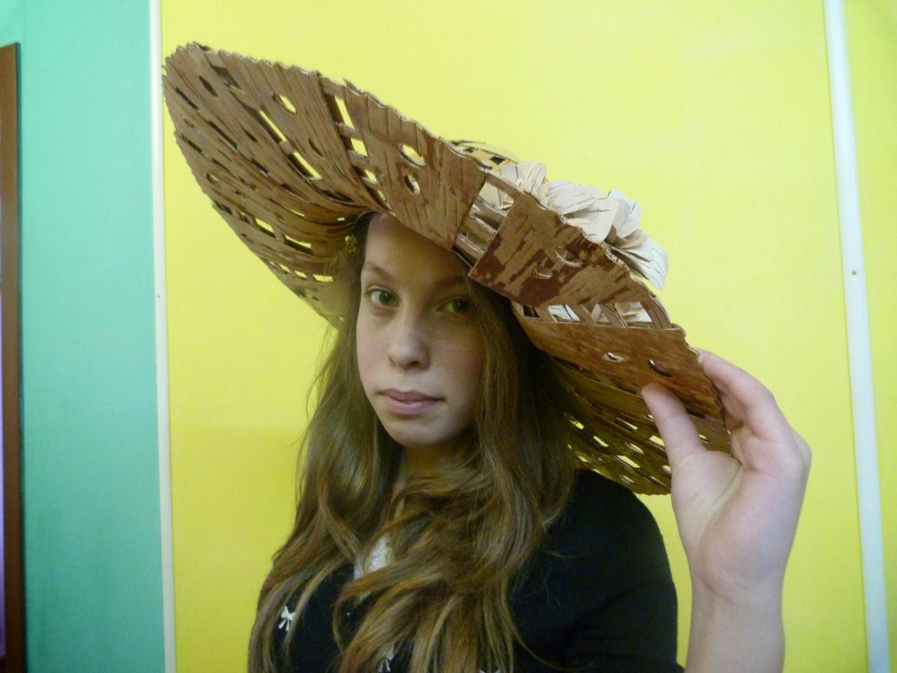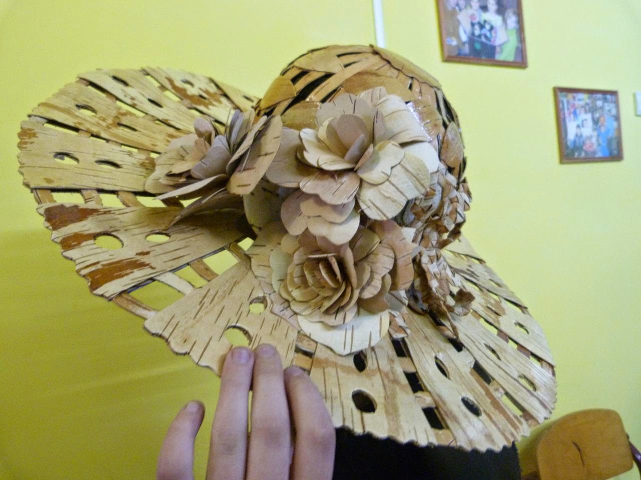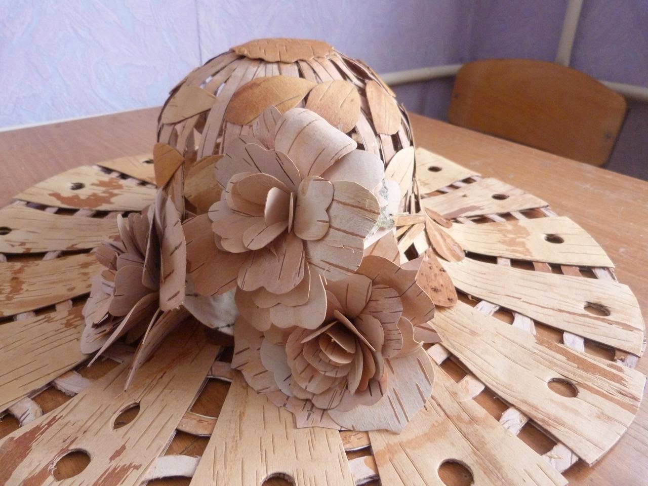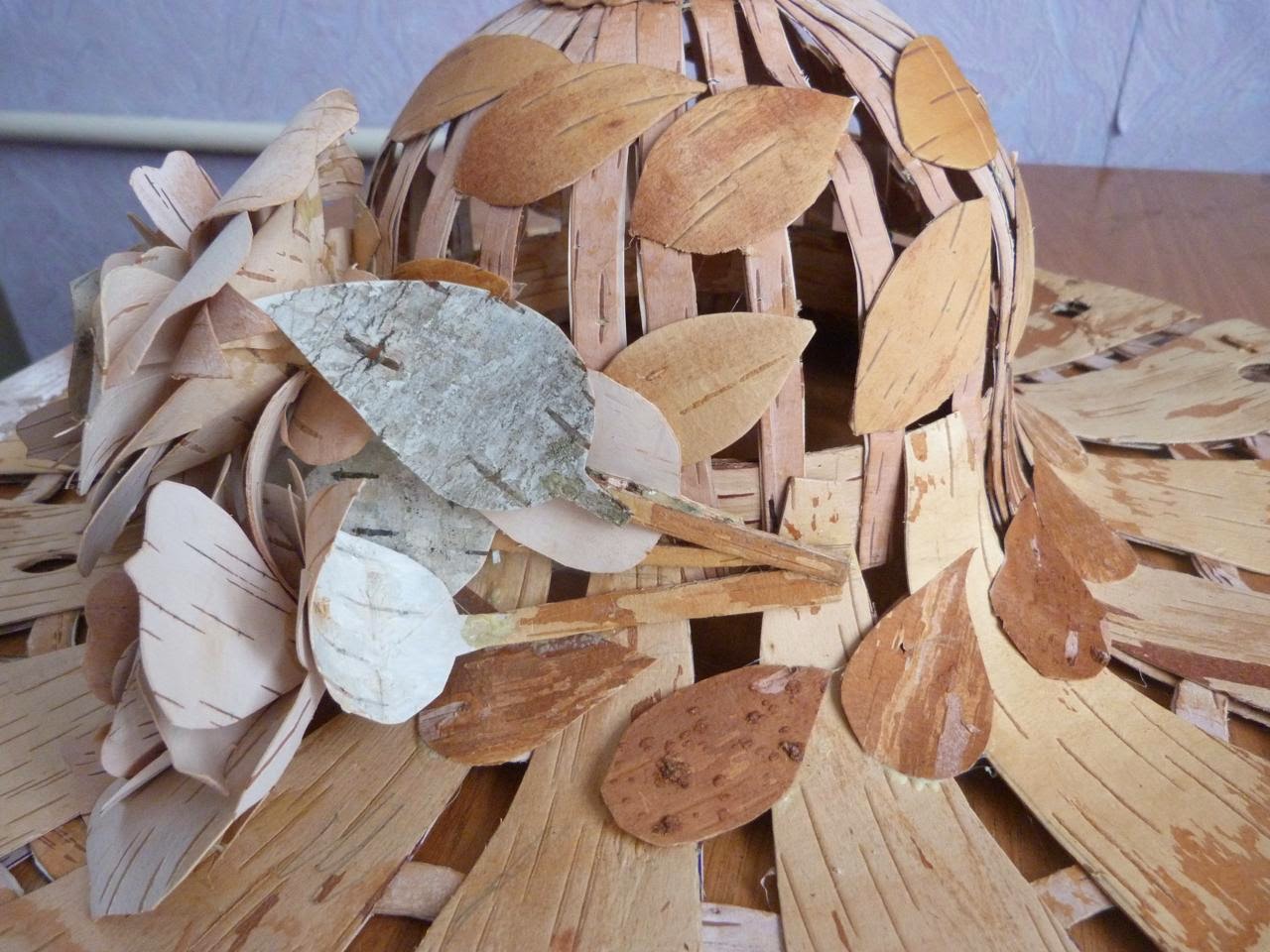 9. Вторым слоем правой стороной вверх наклеиваем из жёлтой бересты листочки и декоративный кружок на верх шляпы