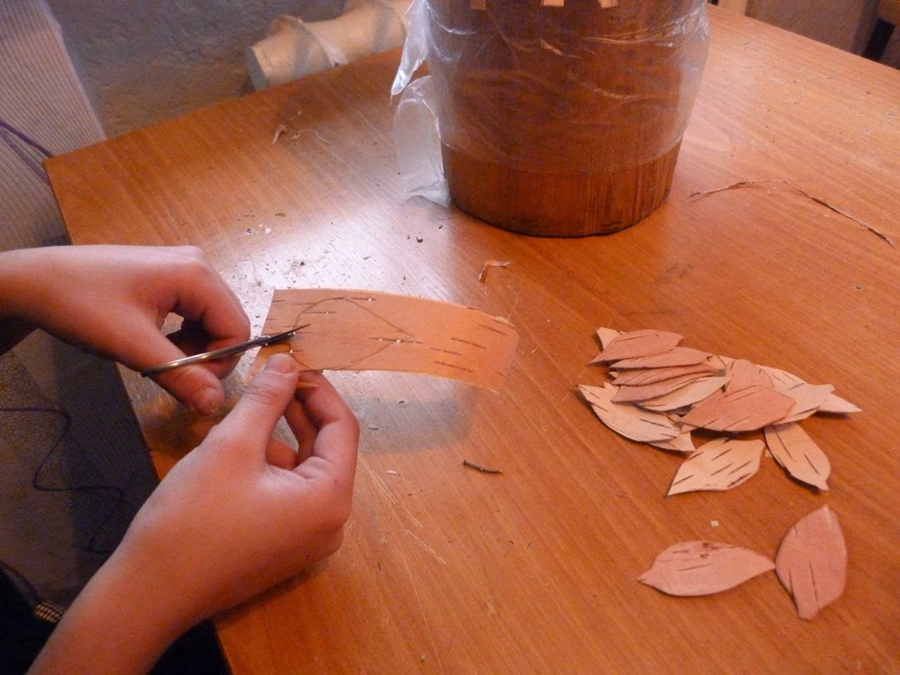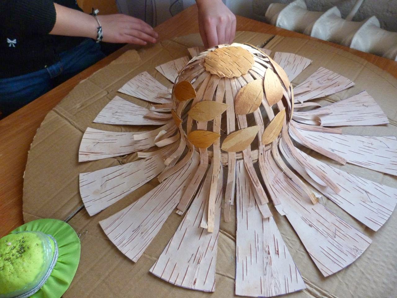 7. Для лучшего крепления полосок, а также для оформления шляпы вырезаем листики из жёлтой бересты и наклеиваем на полоски правой стороной вниз с небольшим наклоном