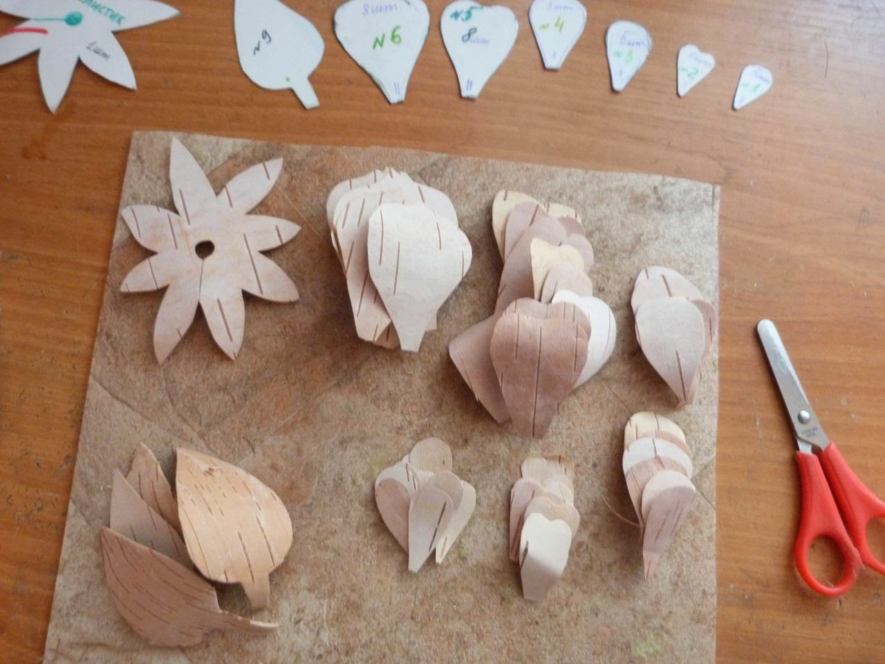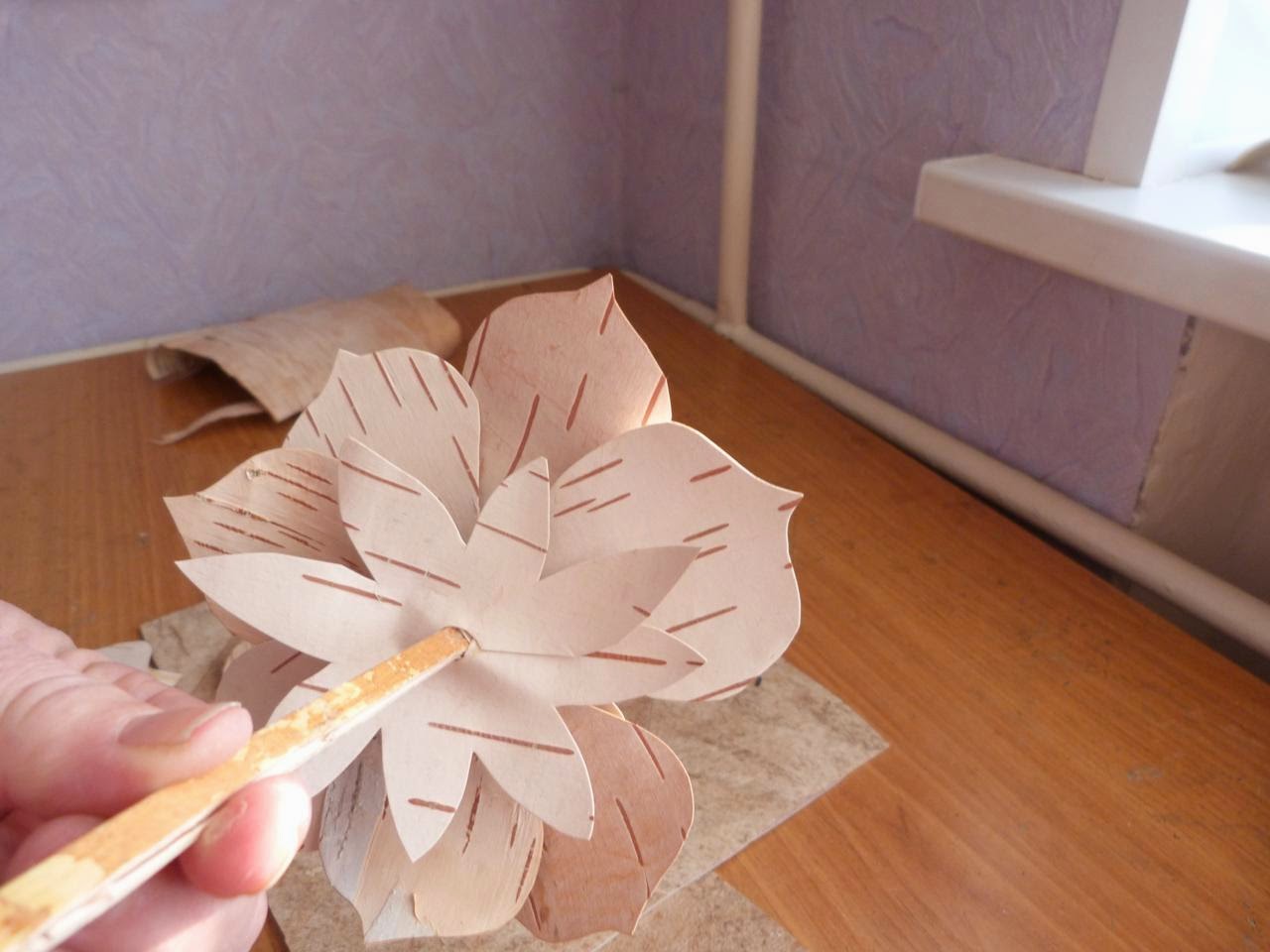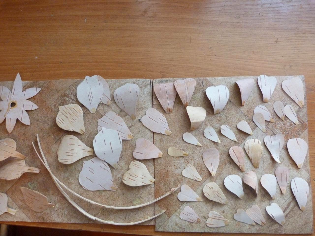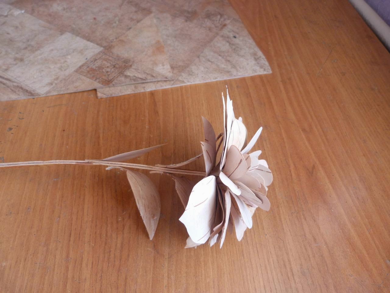 16. Приступаем к изготовлению роз (3 шт.). Для этого из тонкой белой бересты вырезаем необходимое количество лепестков и наклеиваем их по спирали на стебель, который тоже из бересты. Затем вырезаем чашелистик и приклеиваем его под цветок. Несколько берестяных листьев (зелень) приклеиваем на стебель