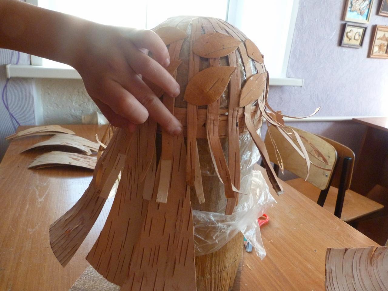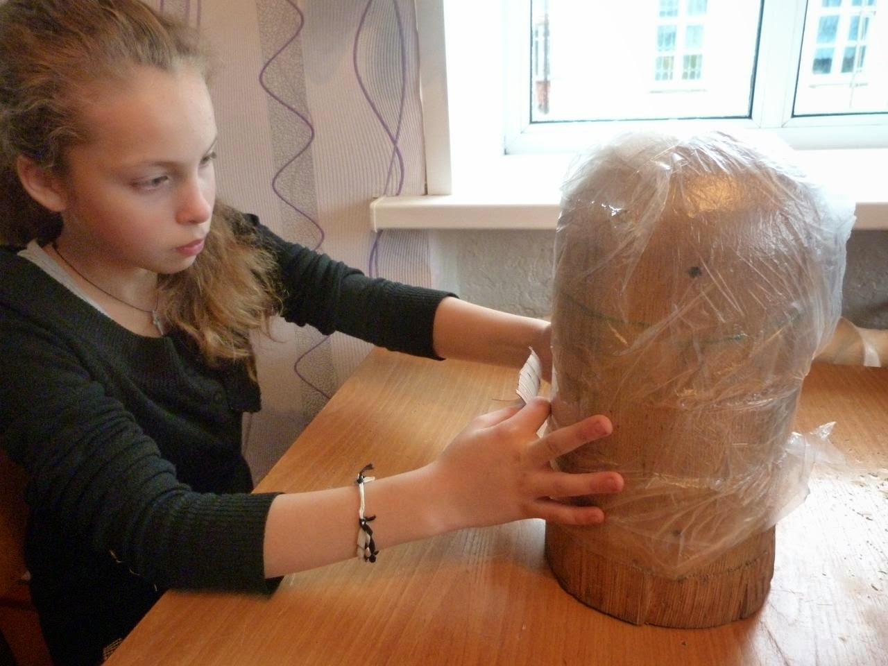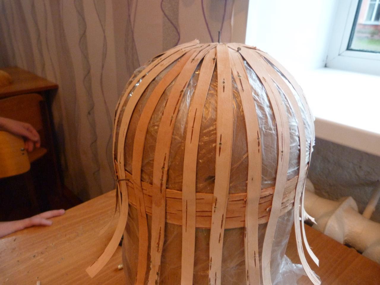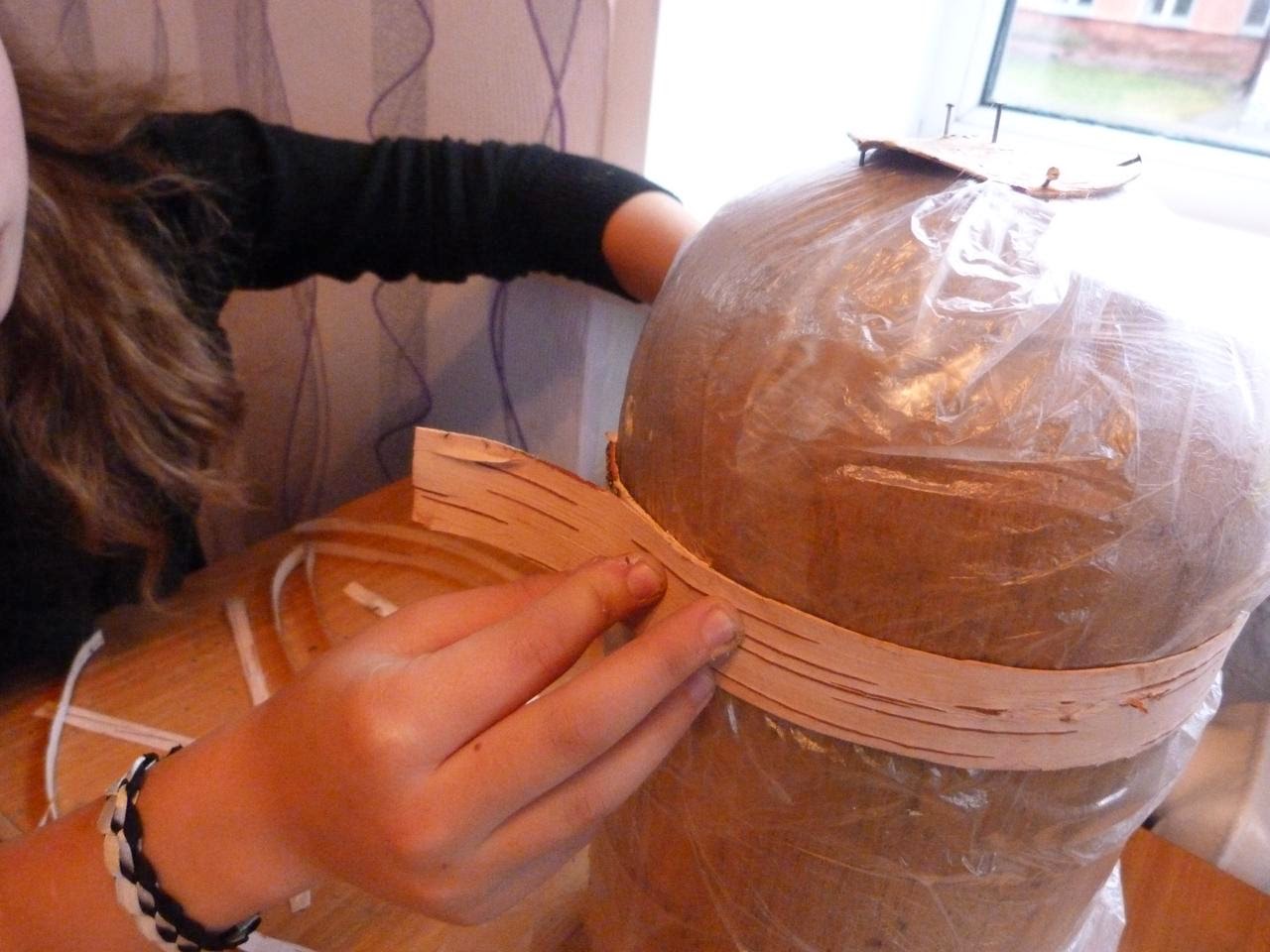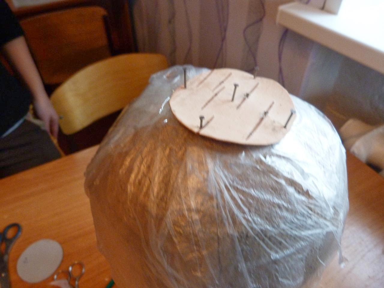 1. Болванку для изготовления головного убора оборачиваем плёнкой, чтобы не замарать клеем
