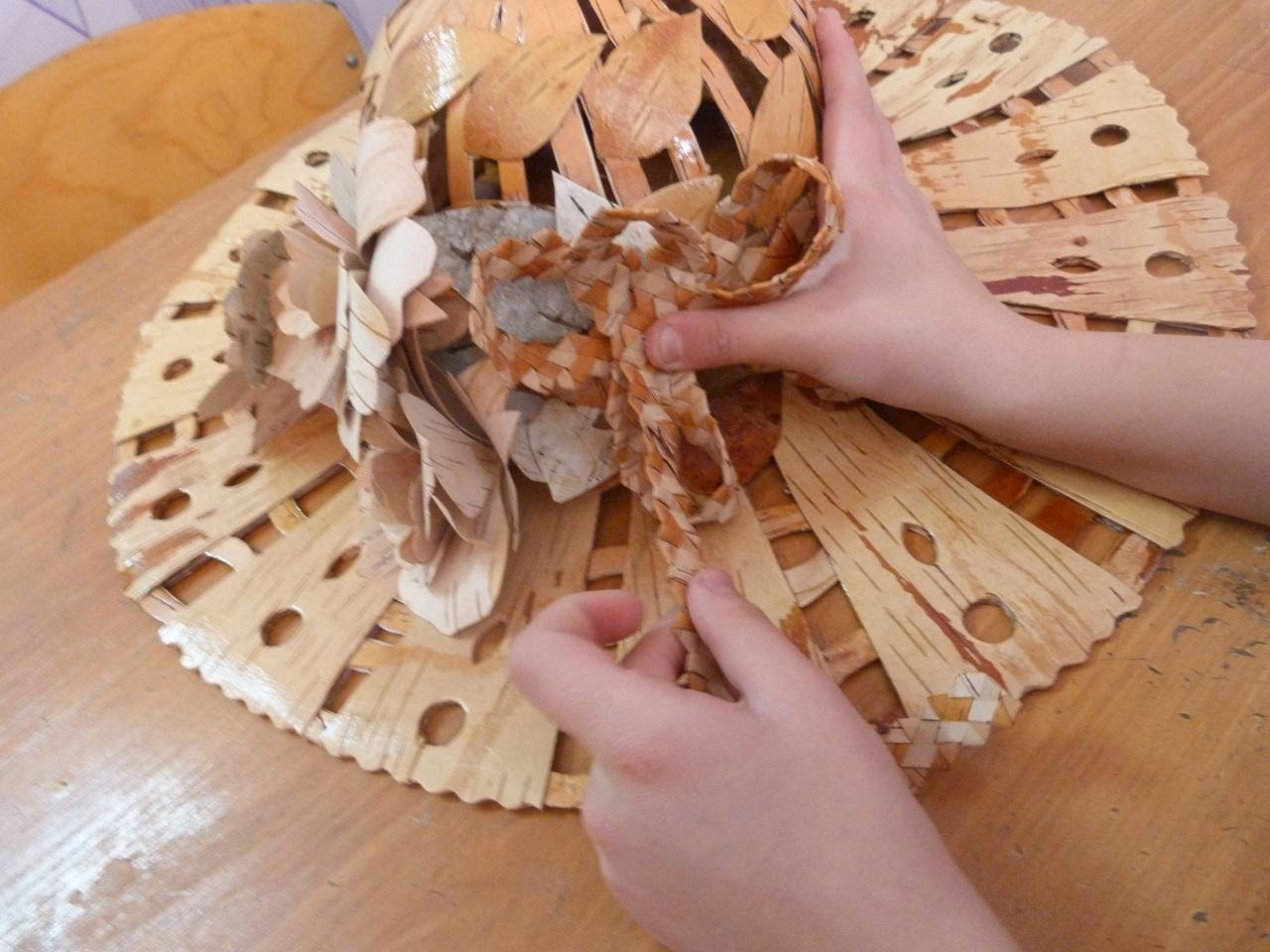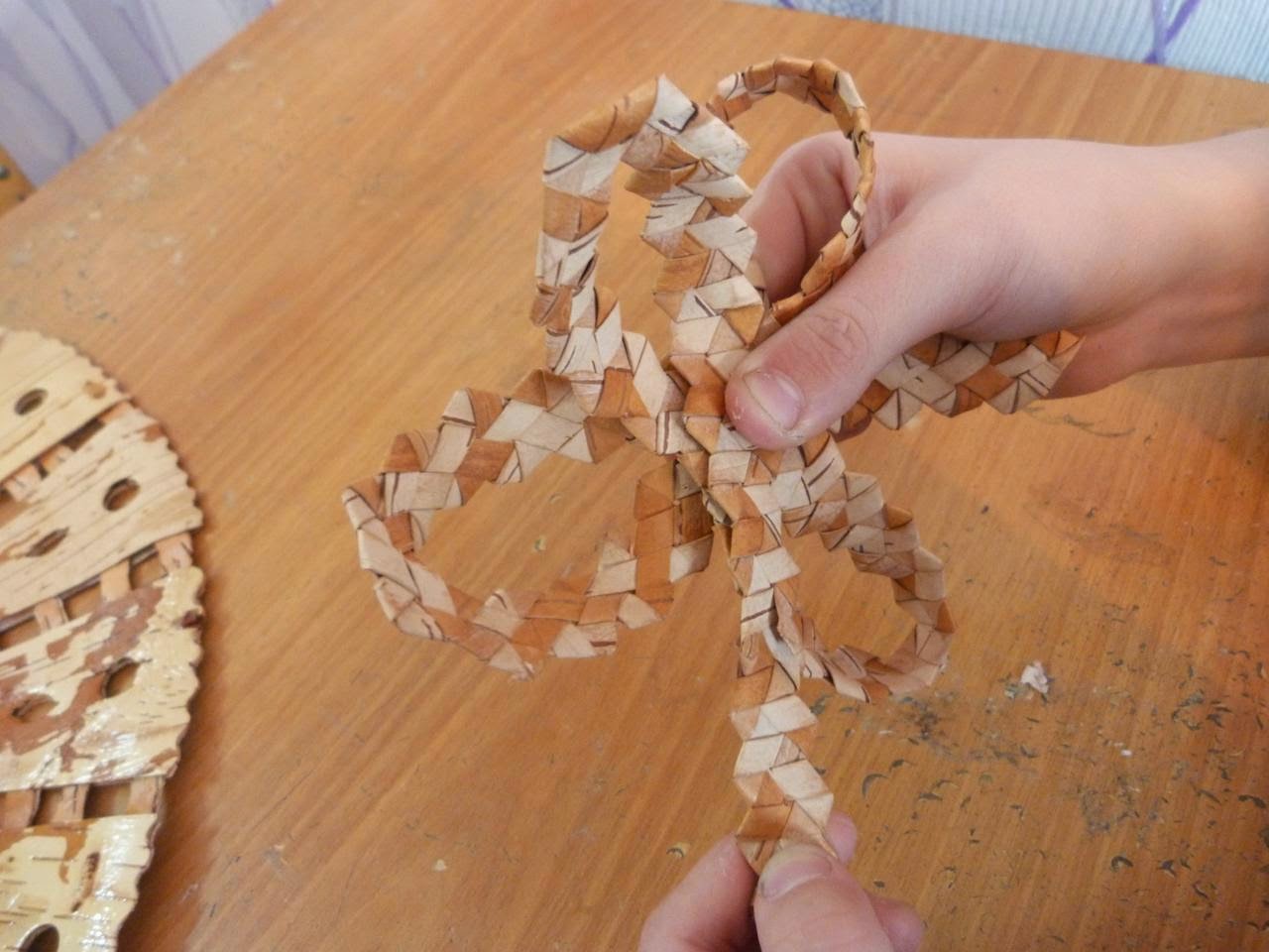 19. Из белой бересты нарезаем полоски шириной 1 см и выполняем плетение «зубатка»
