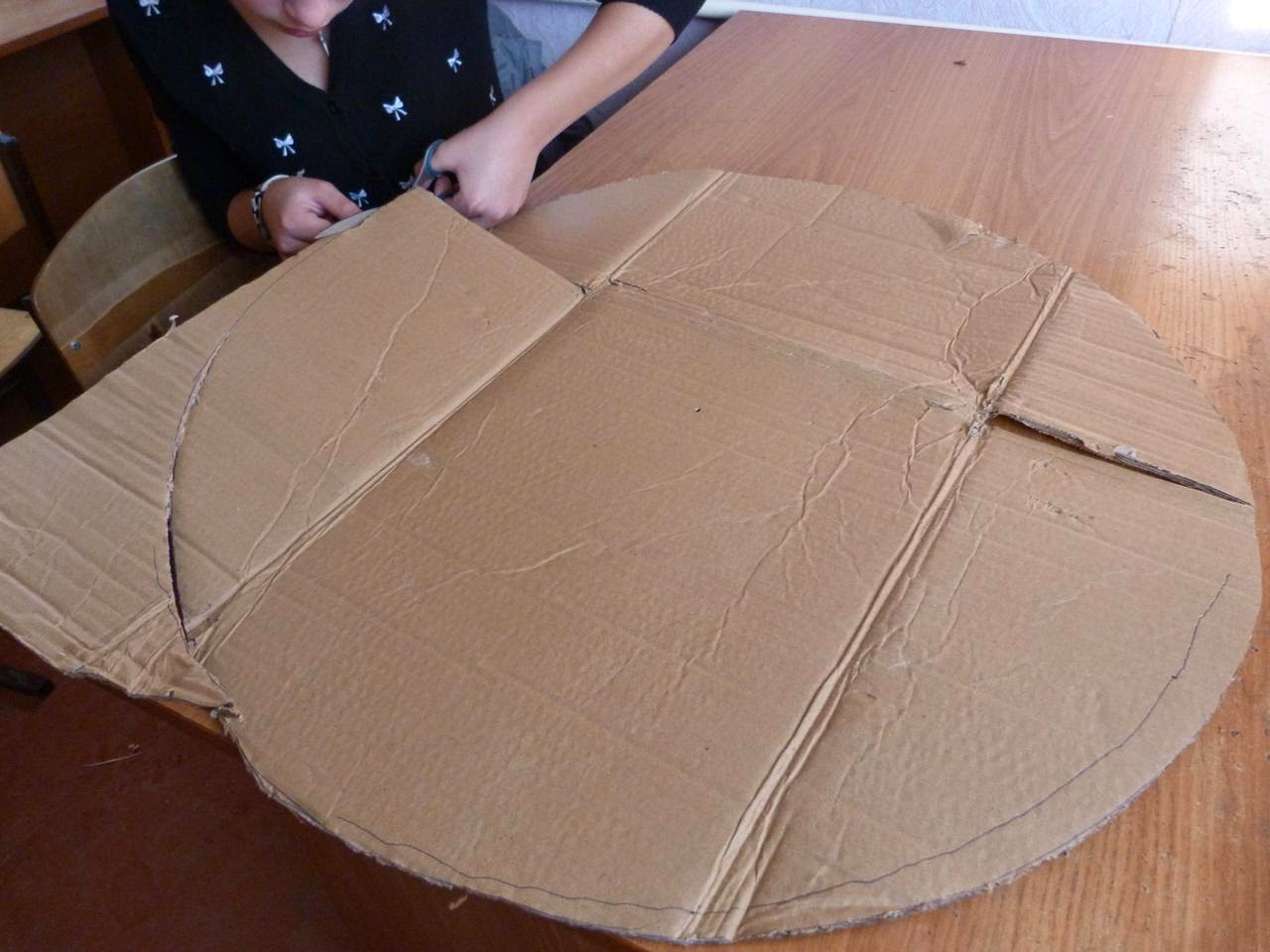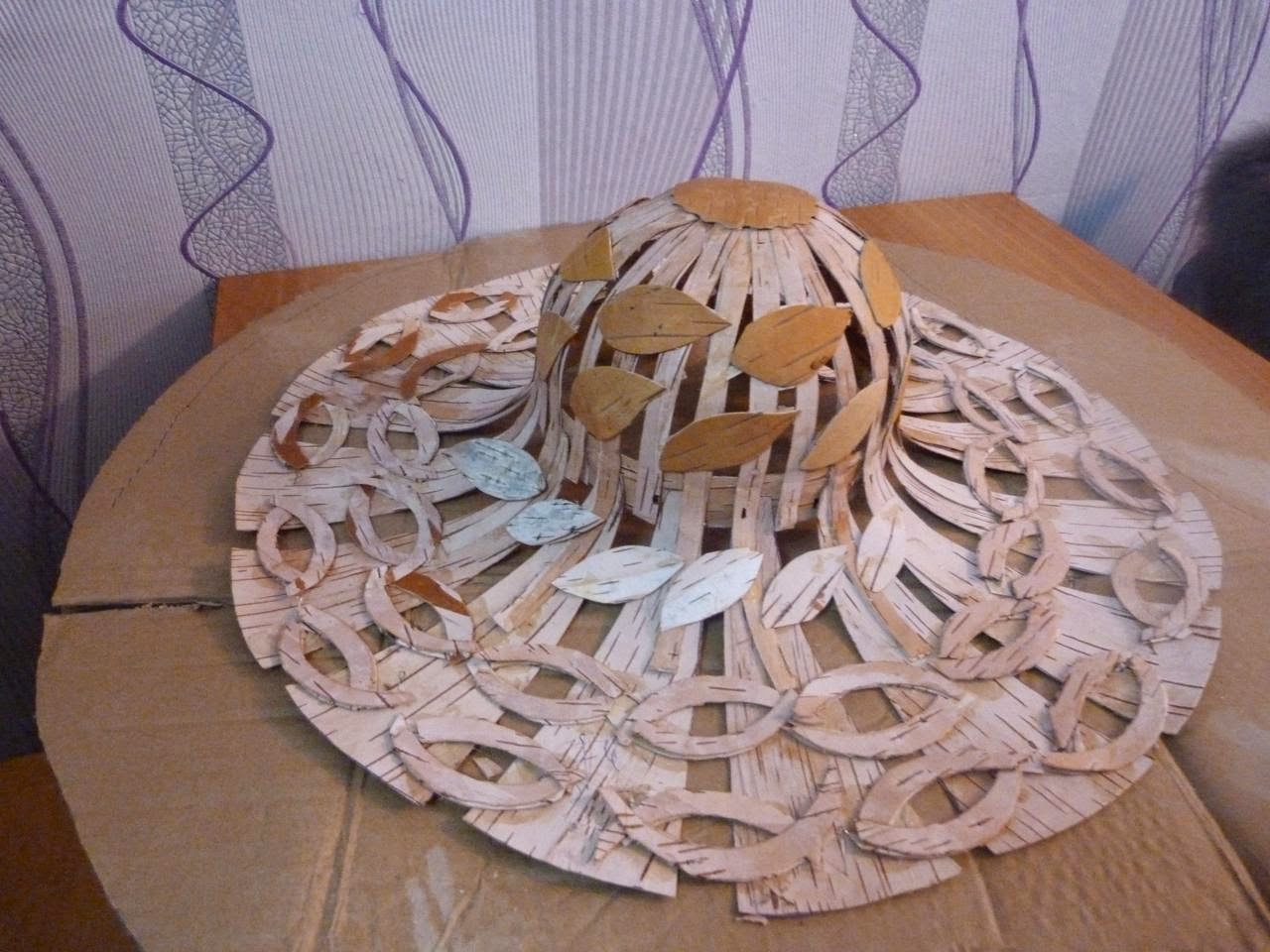 12. Из картона вырезаем круг диаметром 60 см для закрепления полей шляпы на плоскости (закрепляем иголочками)