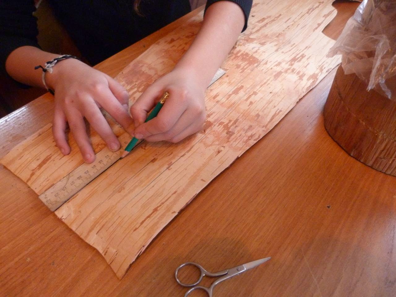 4. Вырезаем из бересты полоски шириной 3 см и склеиваем внахлёст вокруг правой стороны внутрь